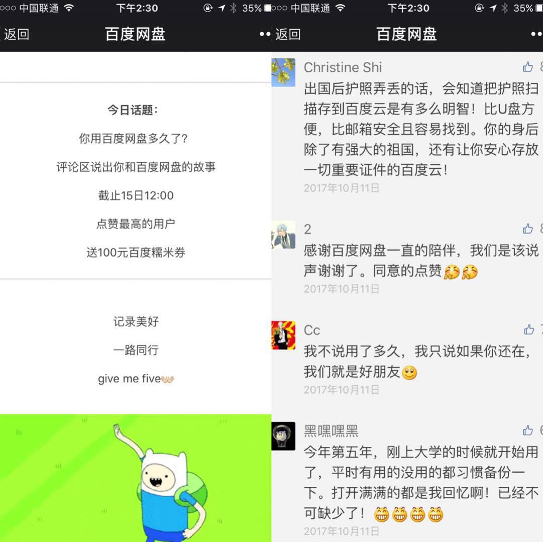 有些寻找情感共鸣的活动,甚至你觉得没有什么创意,但是真的沉淀了很久的产品,这种活动能看到产品的温度。最近看到的一个活动是,百度网盘的活动,就是一个说出百度网盘故事的活动,激起了很多用户的回忆。