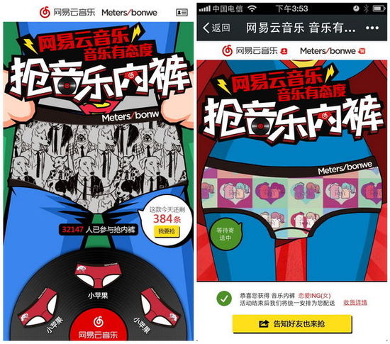 跨界总会容易出亮点,风牛马不相及的两个产品在一起找到结合点,容易让用户惊喜,就像现在综艺节目演员变成跨界歌手、演电视剧的跨界成演小品的。比如网易云音乐与美特斯邦威一起设计了30款内裤,通过帮朋友抢音乐内裤、拍卖内裤、听音乐换内裤等方式,获得了很多用户的追捧,不仅实现了网易云音乐的高曝光、高活跃,还是实现了美特斯邦威内衣品类5年销量最高。