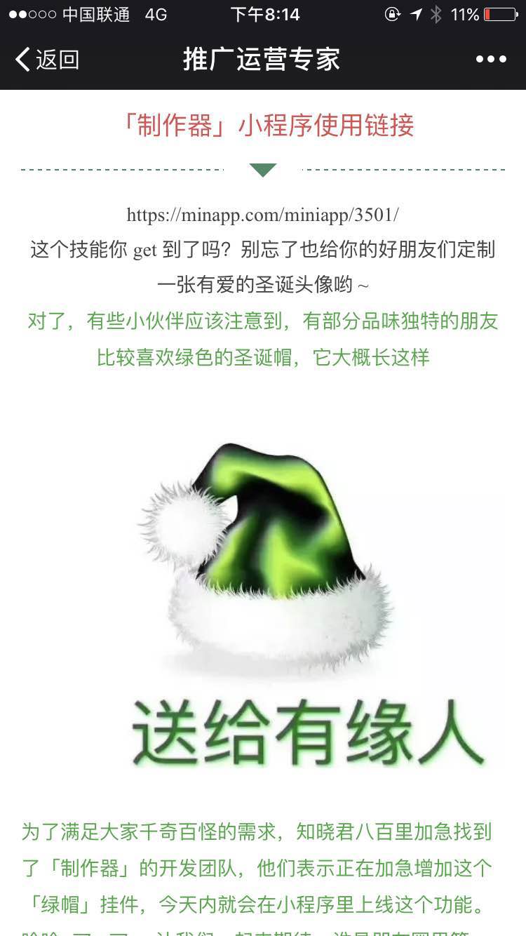 实际上微信春节摇一摇抢红包就是一个可预见的时效性活动,这个时效性活动就是利用了传统习俗吸引了1亿多人的参与;而在马年的时候,马上有XX头像迅速串红,笔者也曾经做过一个活动,就是通过编辑文案、或者上传用户自己的照片,可以生成“马上有XX”的头像,这也是一个抓热点的活动,获得了用户量2倍以上的激增;这跟今年的圣诞帽的热点很想,反应快的开发者已经在开发了微信小程序“圣诞帽”的工具。