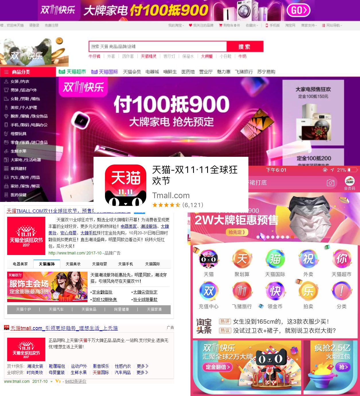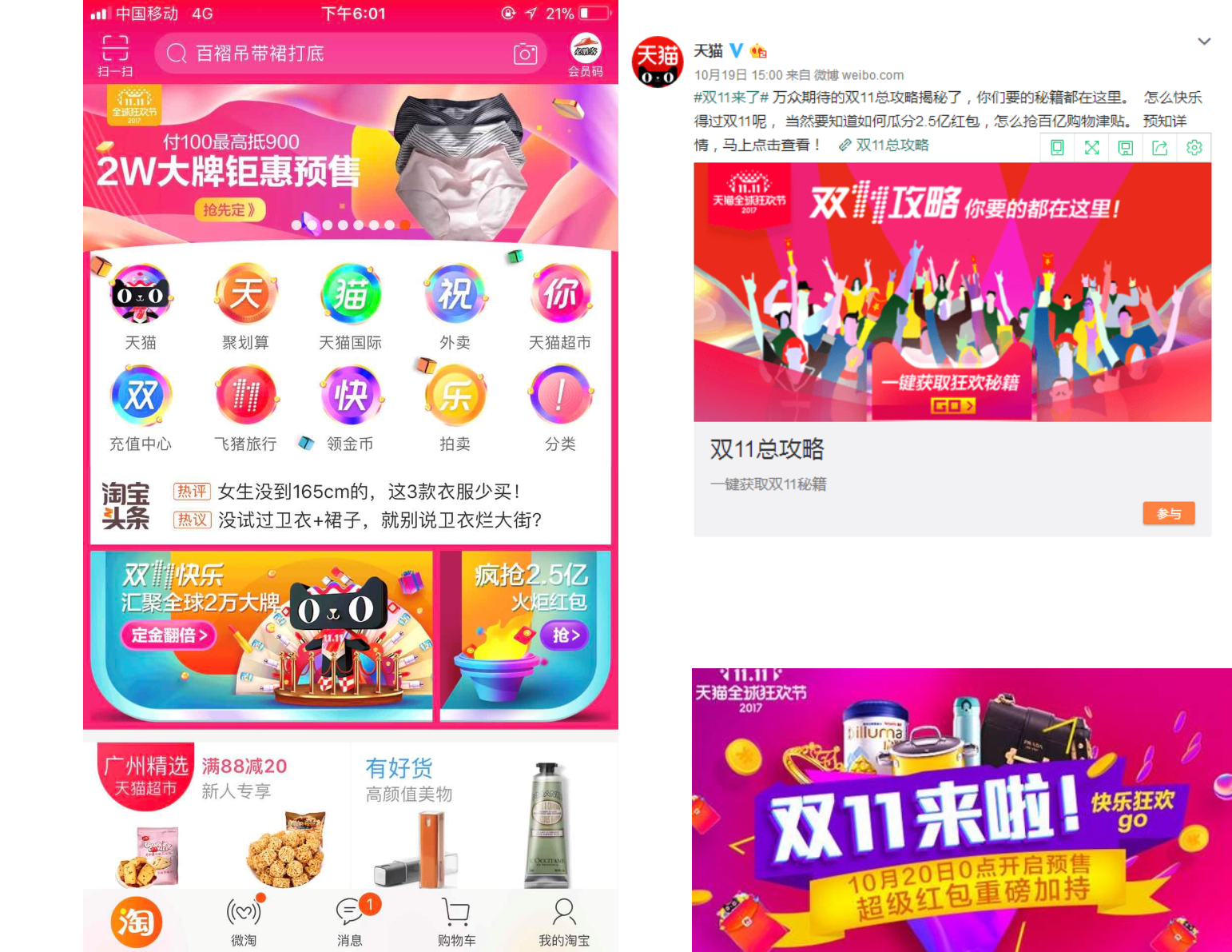 2017年天猫的双十一促销预热页面,分别在站内站外都已经全面铺开,开启了全方位引流,每个页面都能让你有跃跃欲试去点击的想法。