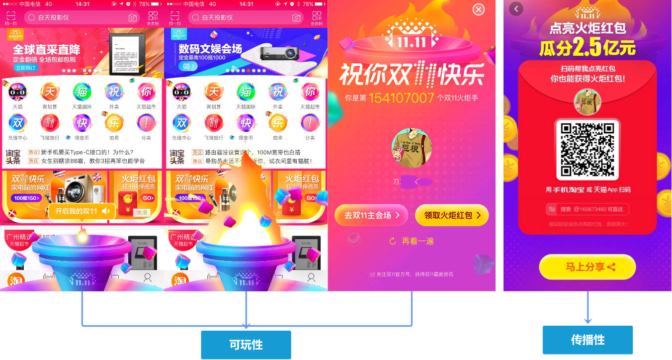 天猫双十一,能让你感受到一种仪式感。这真的很棒。这么有趣好玩你会不会为之传播?不会?这时候天猫立刻告诉你“点亮火炬红包,瓜分2.5亿”“扫码点亮红包,你也能获得火炬红包”