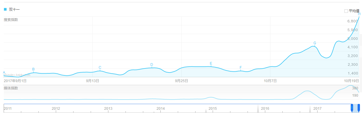 ②营造话题:让我们来分别看百度指数与微指数,从目前的指数来看,从十月中旬,双十一已经开始了话题投放。在10.18日-10.20日期间,指数开始快速增长,整体环比增长175%。(友情提醒:天猫对“双十一”拥有商标专项权,做活动请谨慎)