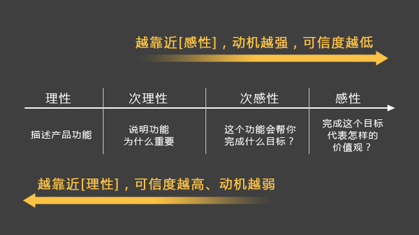 利用“情绪推拉”,我们得到了从理性递进到感性的四句文案。理性文案好像更容易理解,更加可信,但似乎很难唤起动机。感性文案则刚好相反,更容易唤起动机,但不容易被理解,可信度不高。我们到底应该选哪一句呢?