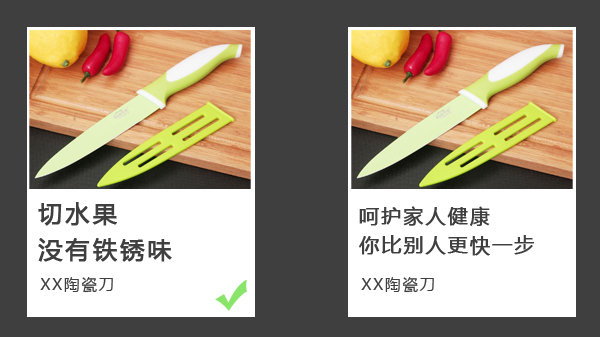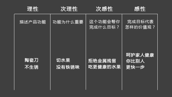 如果你的产品只要说出卖点,别人自然就有购买动机。营销的重点是说明功能。这时候应该选择理性作为切入点。像陶瓷刀,偏理性的文案更合适。
