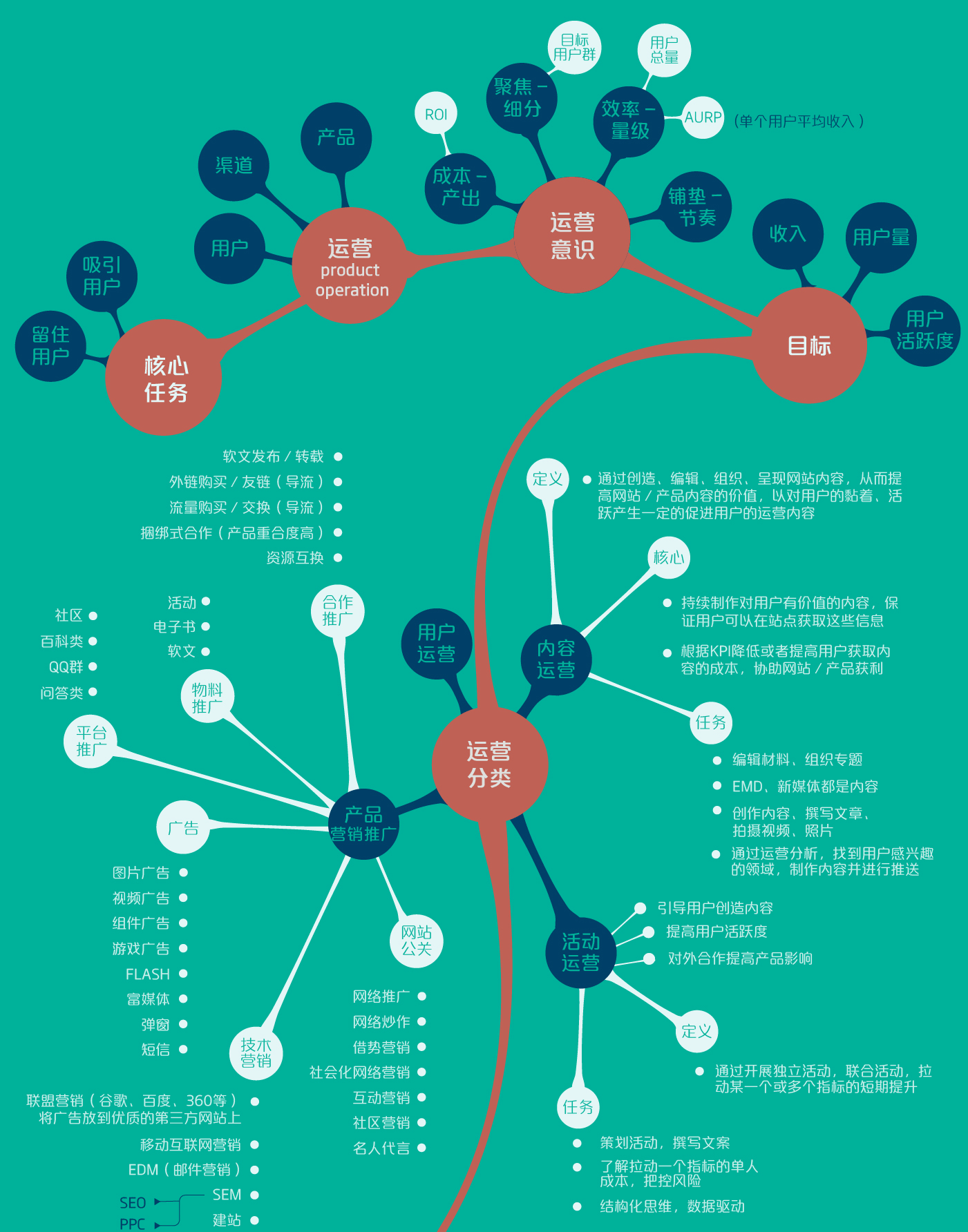 运营的核心任务是吸引用户、留住用户;运营目标:收入、用户量、用户活跃度;