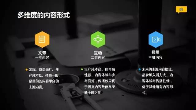 主要是互动内容,生产成本高、病毒属性强、内容体验与参与度好,传播效果优于图文内容数倍,甚至数十倍之多。