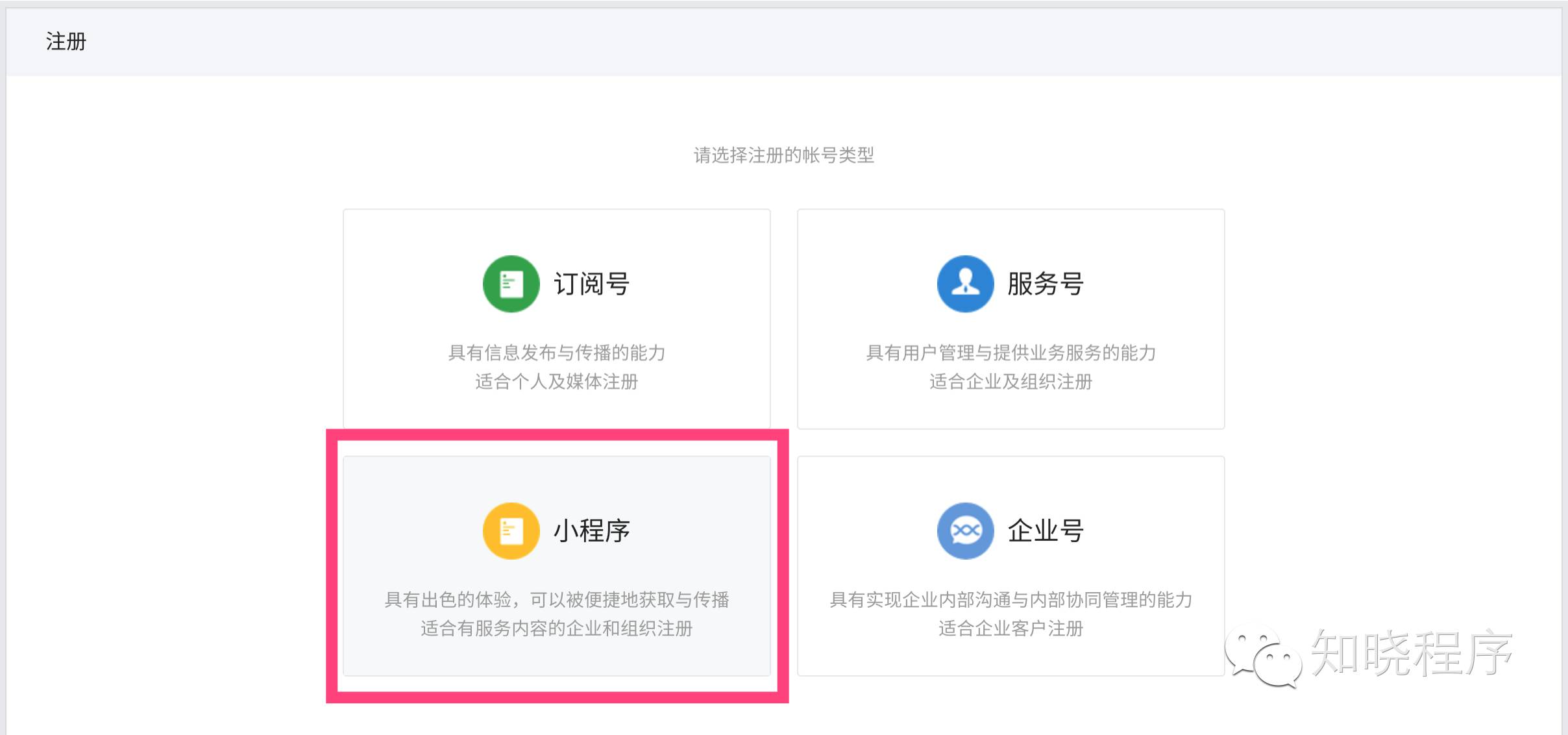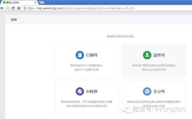 可以看到,除了常规的订阅号、服务号和企业号之外,还出现了「小程序」的选项。